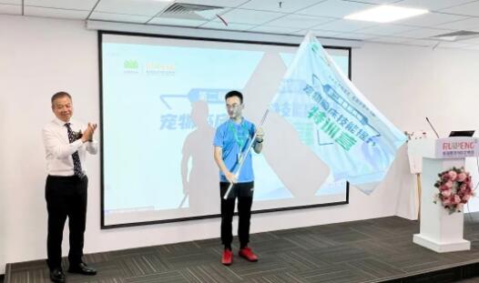 项目介绍结束后,进入本次特训营的交旗仪式,由深圳市瑞鹏公益基金会名誉理事长、新瑞鹏宠物医疗集团副董事长刘朗博士与特训营营长----福建农林大学动物科学学院教师胡崇伟先生共同完成。各位领导、嘉宾们共同见证了这激动人心的一刻,至此,第二届暑期教师宠物临床技能提升特训营正式启动!