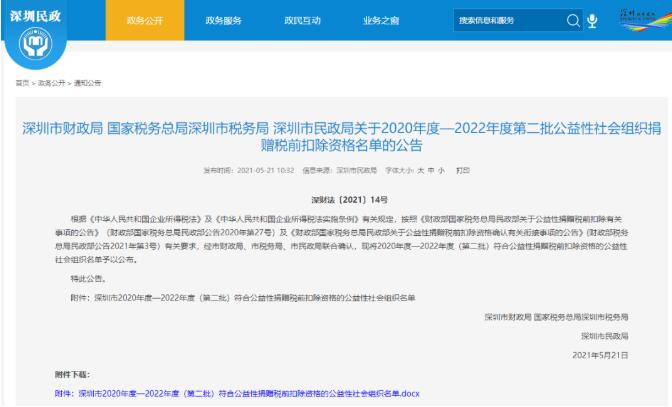 2021年5月21日,深圳市财政局、国家税务总局深圳市税务局、深圳市民政局下发了关于2020年度—2022年度第二批公益性社会组织捐赠税前扣除资格名单的公告。经市财政局、市税务局、市民政局联合确认,深圳市瑞鹏公益基金会取得2020年度-2022年度公益性捐赠税前扣除资格。