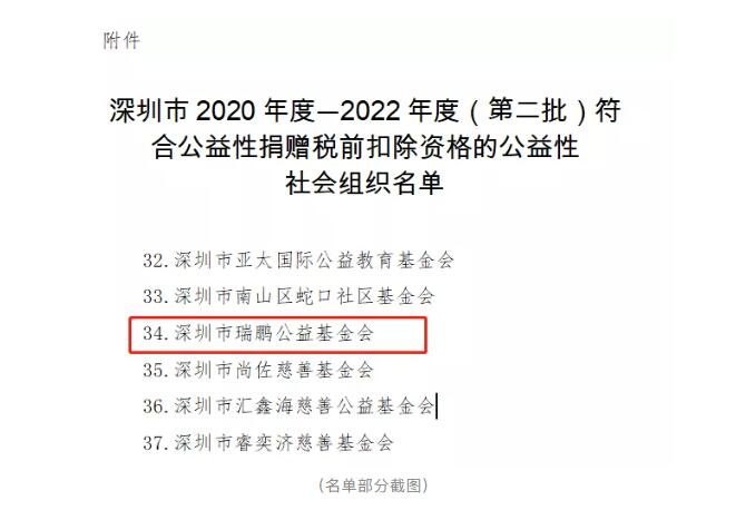 喜讯|深圳市瑞鹏公益基金会取得2020年度-2022年度公益性捐赠税前扣除资格!