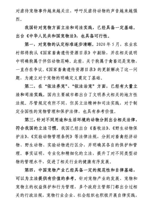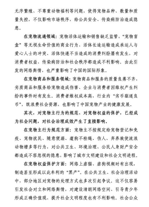 随着我国经济社会快速发展和人民生活水平提高,我国宠物产业实现了快速发展,宠物保有量和产业规模都达到较高水平。以犬、猫为代表的宠物,成为人民群众日常生活的重要组成部分。随着经济社会持续发展,人民群众对民主、法治、公平、正义、安全等方面的需求和用法治保障人民安居乐业的要求日益增长。宠物产业涉及繁育规范、流通安全、质量安全、宠物主行为规范、宠物权益保护等诸多方面,不但关系到整个产业的健康发展,也会影响社会公共安全、公共卫生、消费者权益、社会公序良俗等各个领域。