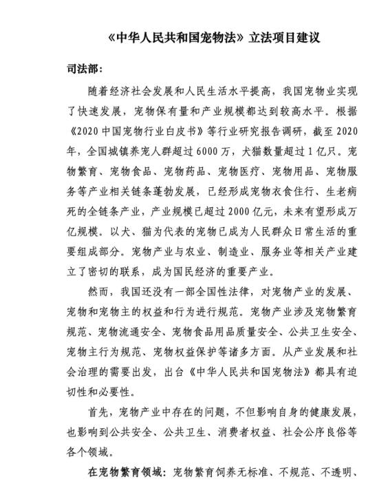 深圳市瑞鹏公益基金会发起并联合中国畜牧业协会宠物产业分会、中国兽医协会宠物诊疗分会、中国小动物保护协会、中国畜牧兽医学会小动物医学分会、北京小动物诊疗行业协会和智惠乡村志愿者服务中心从推动宠物产业健康发展和社会治理、人民期盼的需要出发,共同向司法部发出制定《中华人民共和国宠物法》立法项目建议。