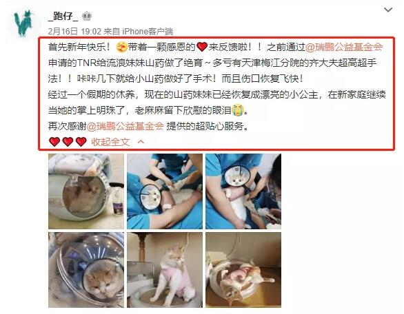 后来成功申请到绝育名额,带着小猫去到新瑞鹏品牌旗下的一家医院时,得知其实也可以直接在微博上向@瑞鹏公益基金会这边申请TNR绝育名额,因此自己后来也有坚持关注这个项目并陆续几次申请到了免费绝育的名额,能帮助为这些流浪的小家伙们做一些很有意义的事情。