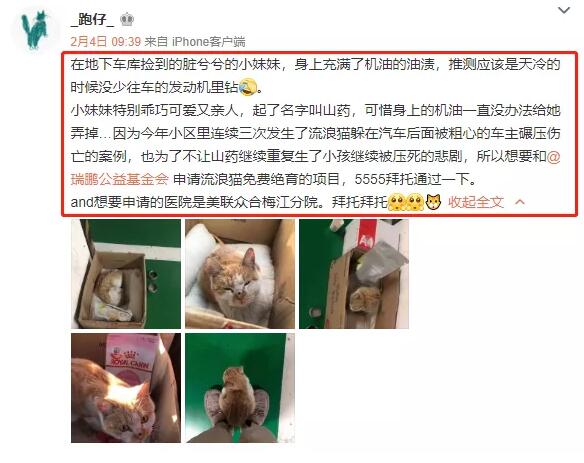 今年小区里连续三次发生了流浪猫躲在汽车后面,最终被粗心的车主碾压伤亡的案例,为了不让山药重复一些流浪猫生了小孩,小猫未来却可能会被压死的悲剧;同时了解到绝育对动物身体的诸多好处,可以起到避免动物因为发情而争斗或攻击人类,同时还能延长寿命等的优点,@_跑仔_在微博尝试着和@瑞鹏公益基金会申请了流浪猫免费绝育的项目。