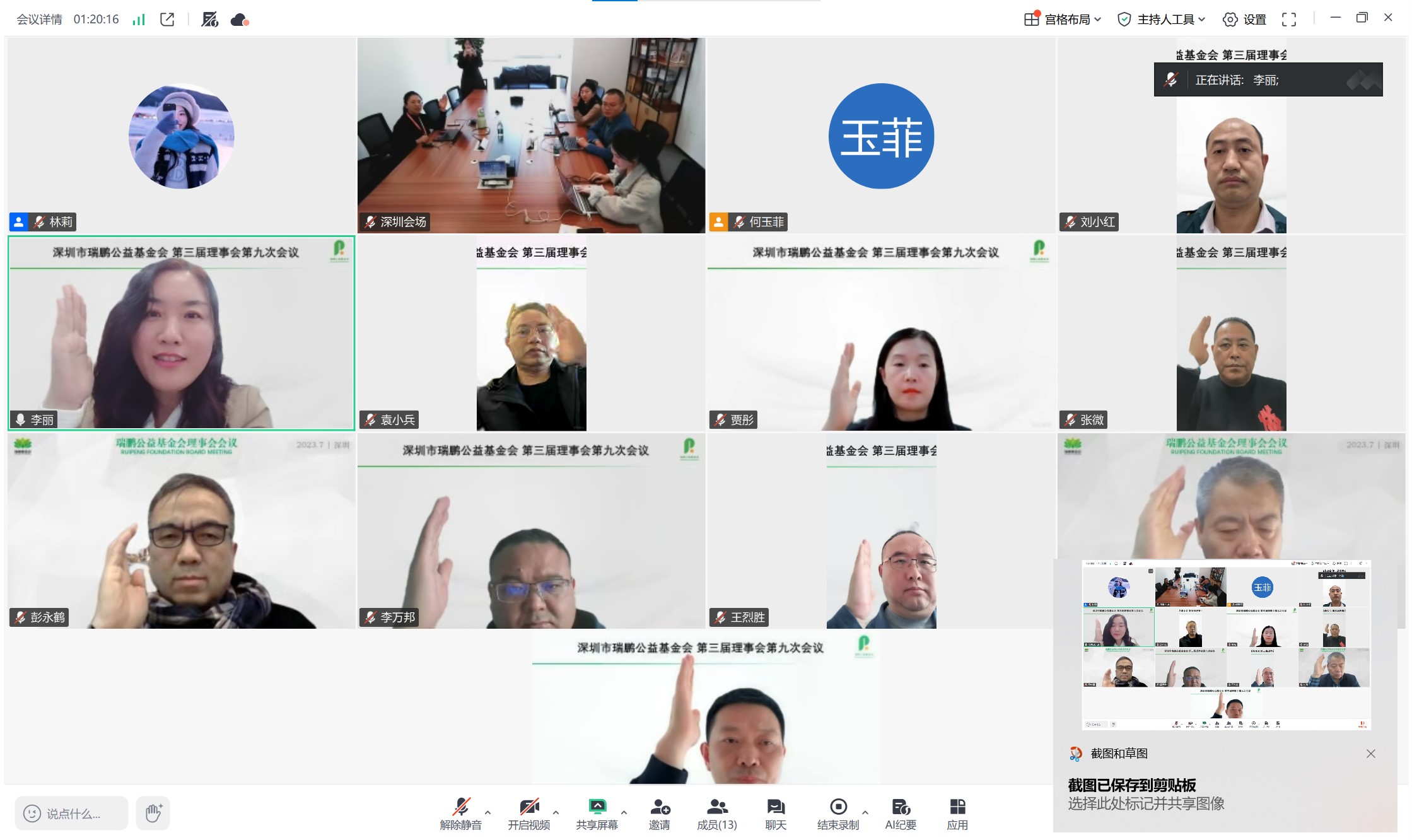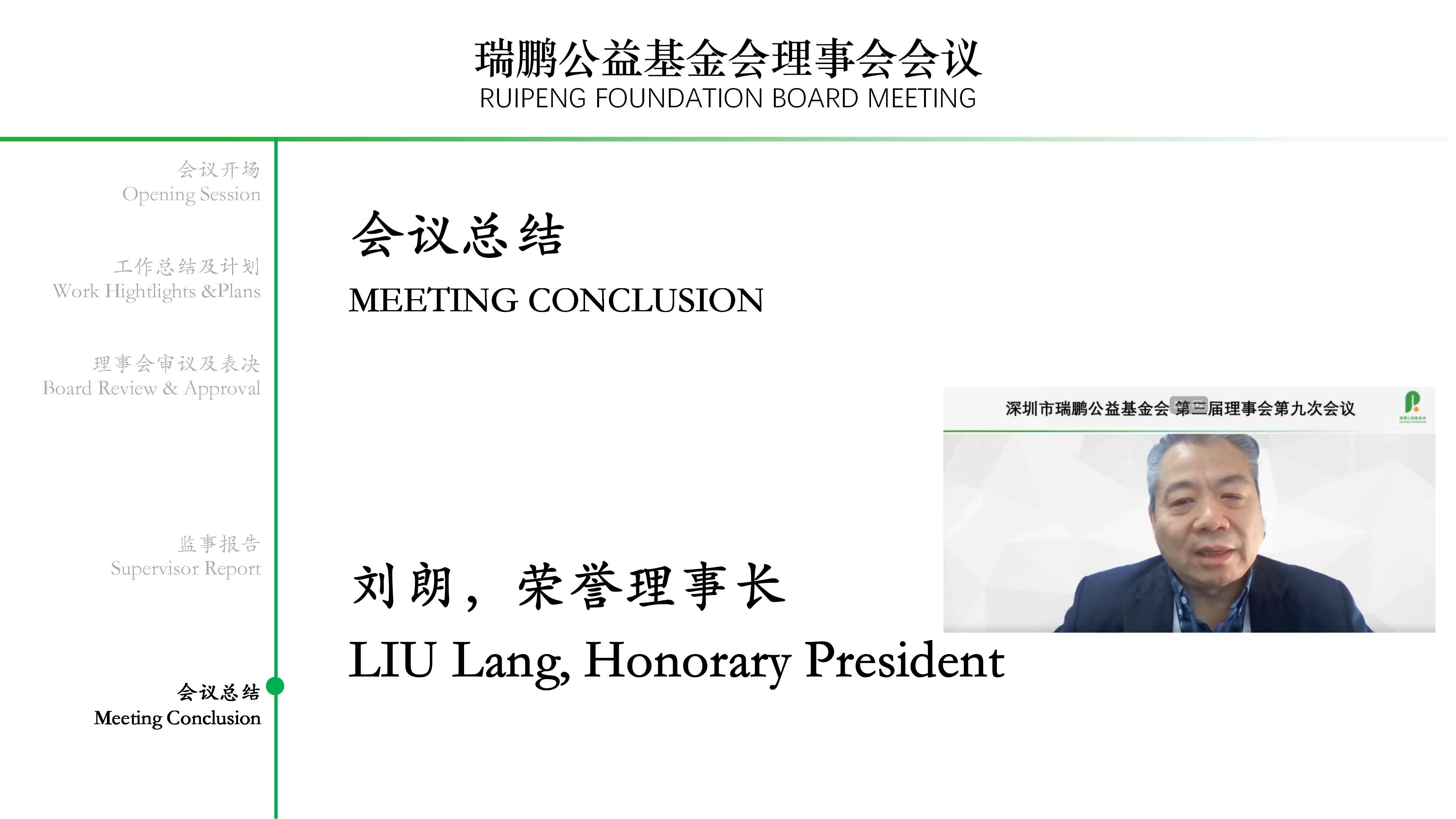 瑞鹏公益荣誉理事长彭永鹤先生在会议最后,代表瑞鹏公益再次向所有理事、监事和秘书处成员的支持和付出表示衷心感激,大家在各司其职的同时也为瑞鹏公益的发展出谋划策、提供资源大力支持。同时,彭永鹤荣誉理事长也对瑞鹏公益下一阶段的发展提出了新的要求和期待,期望在未来,理事会要以更饱满、更笃定的战斗力为瑞鹏公益提供战略支撑和引领,秘书处伙伴则要更踏实、更高效地做好各公益项目落地开展,同心协力,共筑瑞鹏公益未来发展的坚实根基。